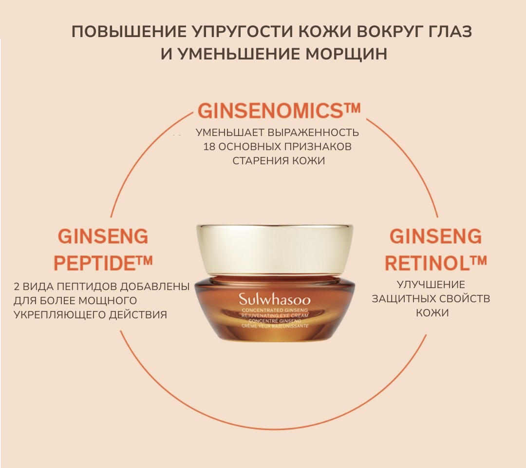 Новый Concentrated Ginseng Rejuvenating Eye Cream — обновлённая версия культового крема Sulwhasoo для области вокруг глаз, созданная на основе 60-летних исследований женьшеня. Формула направлена на улучшение упругости, повышение плотности и уменьшение морщин в деликатной зоне вокруг глаз.