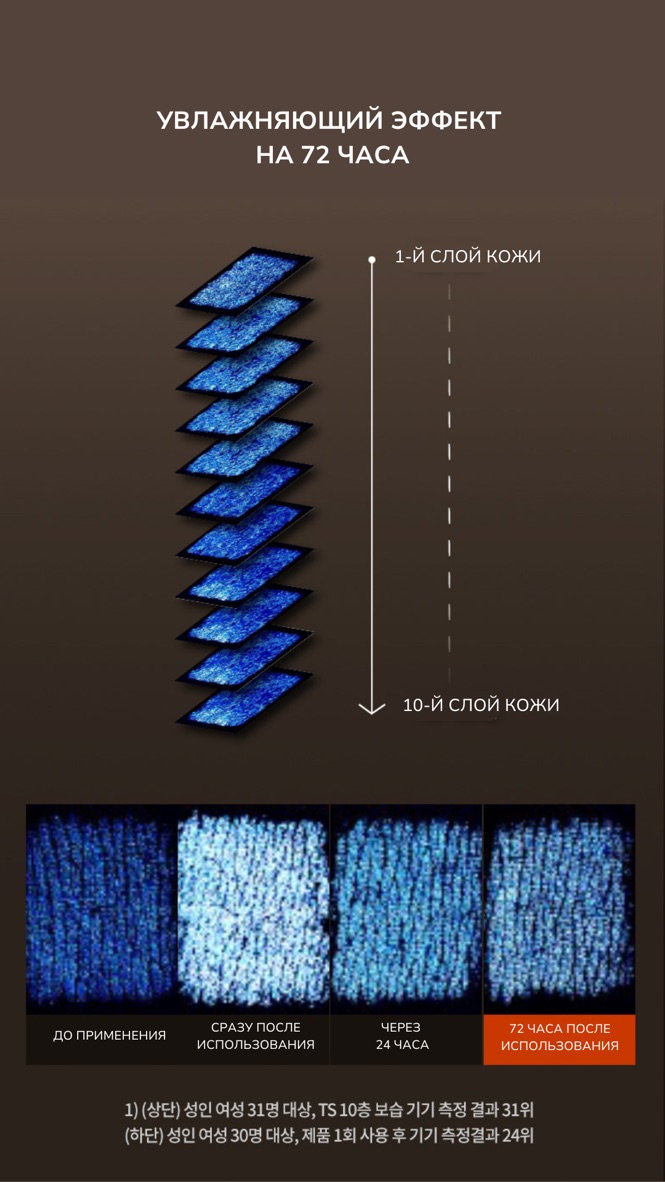 На графике показано сравнение содержания влаги: Сразу после нанесения -> Через 24 часа -> Через 72 часа. Крем увлажняет кожу до 10 слоя.
