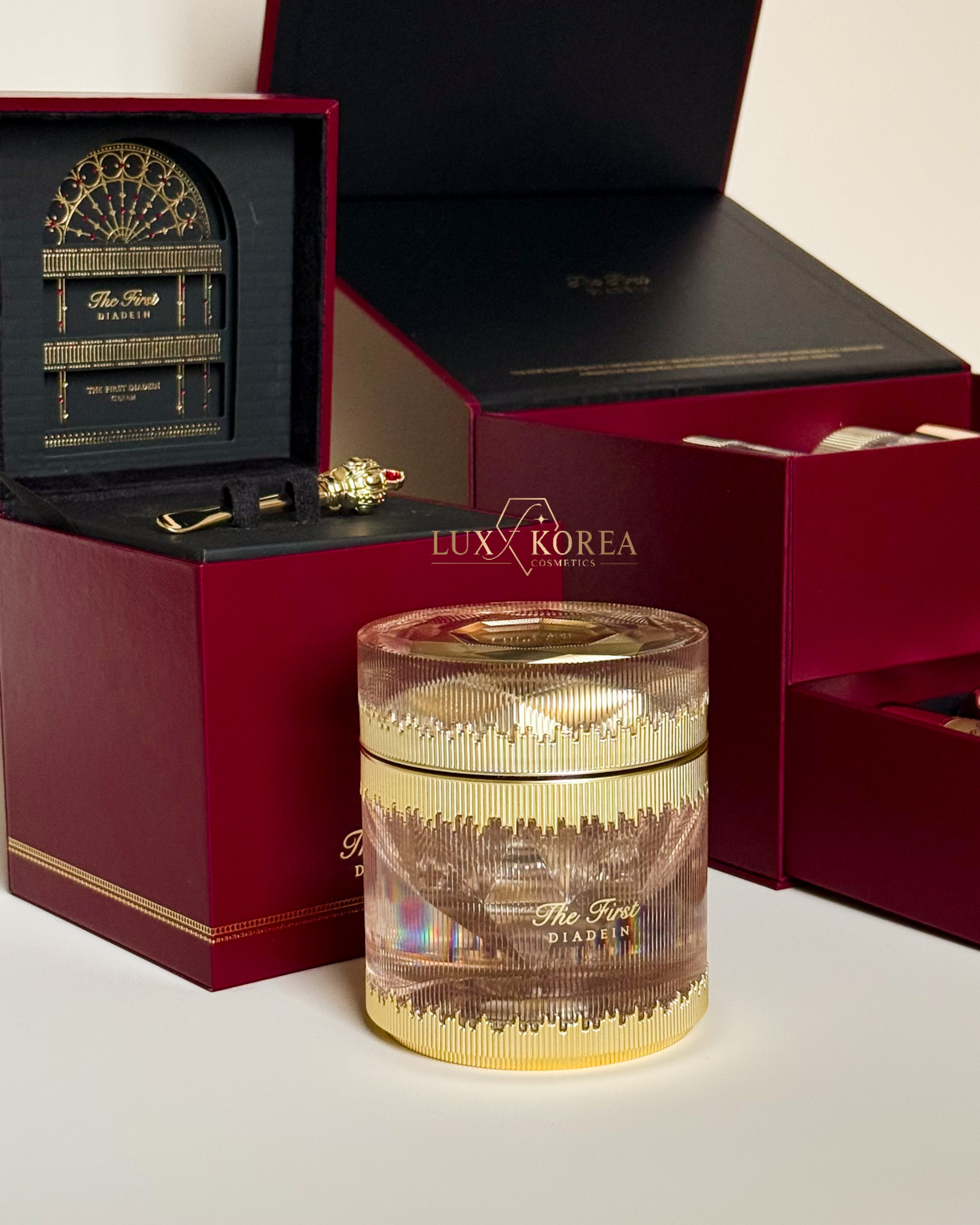 Золотыми буквами выгравирована надпись - THE FIRST DIADEIN CREAM IS A HIGH-END LUXURY CREAM THAT CONTAINS OHUT'S ANTI-AGING KNOWLEDGE IN A DENSE TEXTURE, A BRAND THAT PROMISES REAL SKIN CHANGES WITH AN ADVANCED "DE-AGING" SOLUTION.